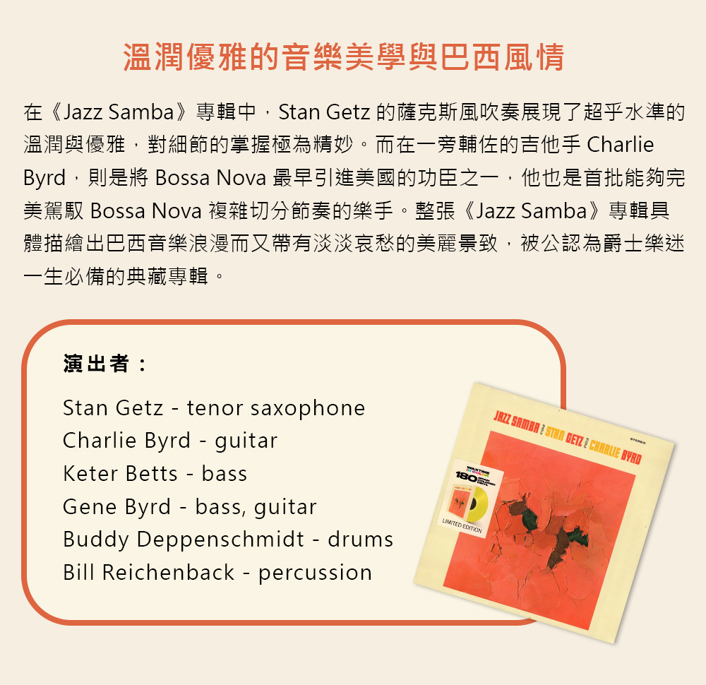 爵士森巴 (180g 限量彩膠),Stan Getz & Charlie Byrd / Jazz Samba ( LP) 黑膠唱片