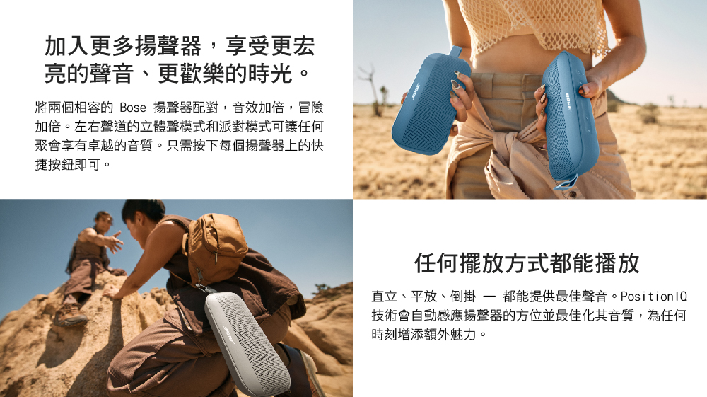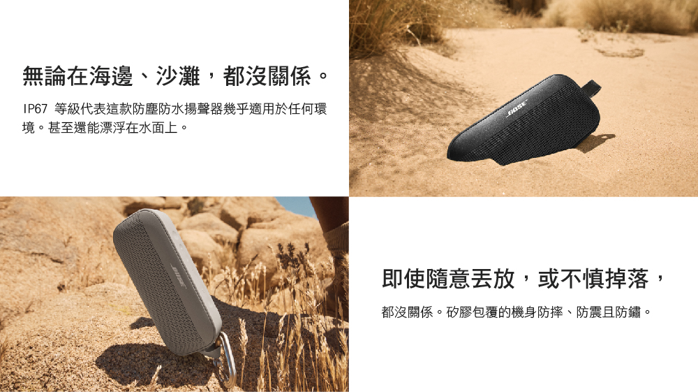 隆重介紹全新升級的 SoundLink Flex 揚聲器。它擁有令人驚豔的渾厚音質,但又小巧便攜,是您在世界各地分享音樂和美好時光的理想之選。此外,它還經久耐用,讓您可以隨心所欲地享受音樂。