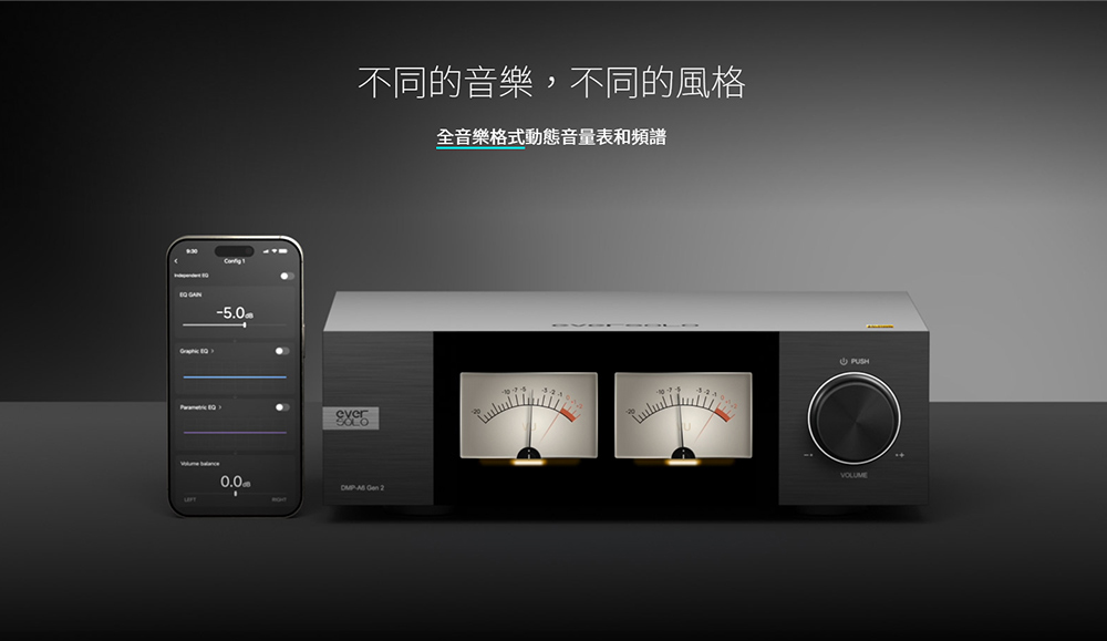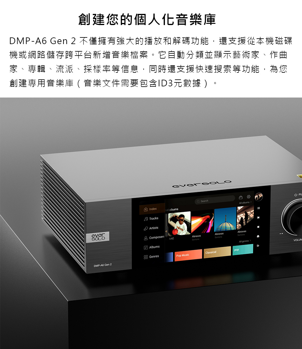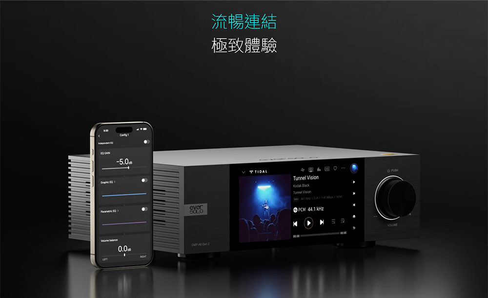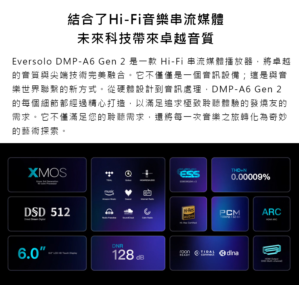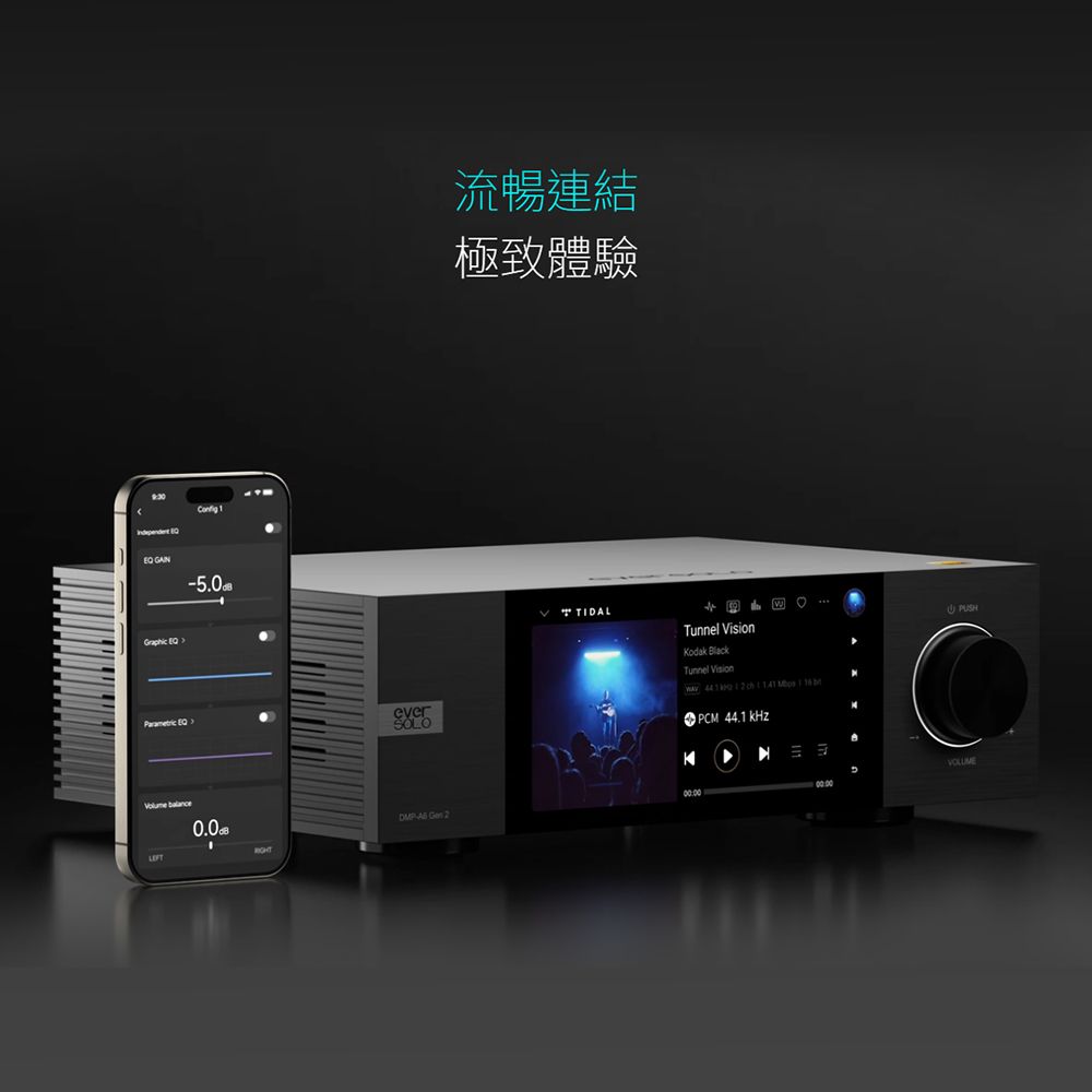 eversolo,DMP-A6 GEN2,串流播放器,DMP-A6,串流DAC播放器,高保真,HIFI,串流機,播放器,CNC工藝,DMP-A6大師版 Gen 2,飛秒時鐘,超低噪,Jitter時鐘系統,OPA1612,運放陣列,雙ES9038Q2M,XMOS晶片,DSD512 Native,EOS 音訊引擎,EVC輸出引擎,Roon Ready,Tidal Connect,四核 ARM Cortex-A55 處理器