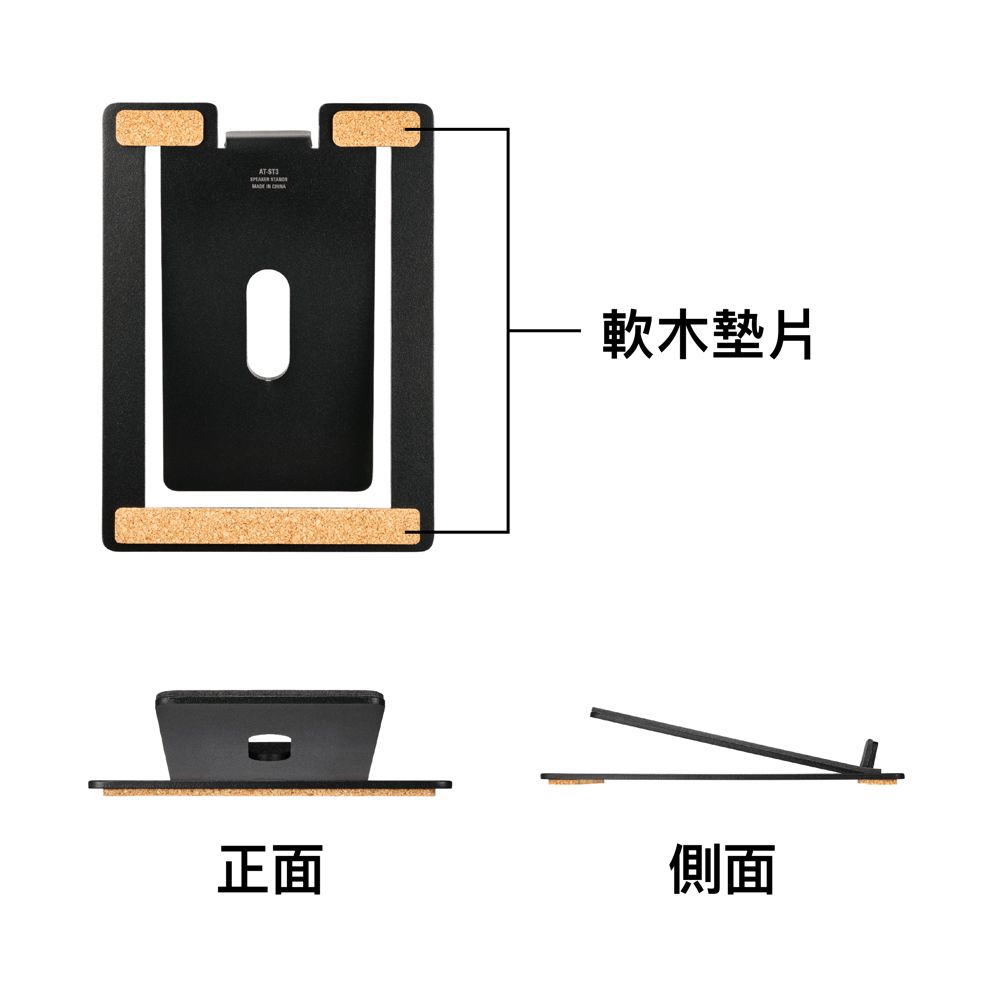 支架本體採用堅固的鋼合金材質,底部搭配可抑制多餘振動的軟木墊片,以及提升安裝穩定性的聚氨酯泡棉,能穩固承載最重達3kg的喇叭。約13°的傾斜角度設計,模擬了喇叭稍微遠離聆聽者位置的擺放情境,將聲音朝上擴散,有效傳遞至整個空間。