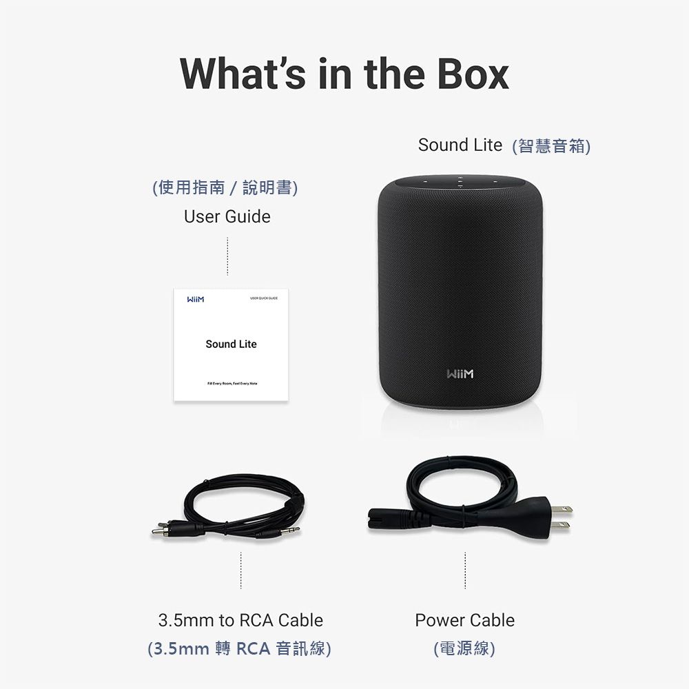 Sound 包裝內容:Sound本體 / Remote2 Lite遙控器 / 電源線 / 音源線(3.5mm to RCA)